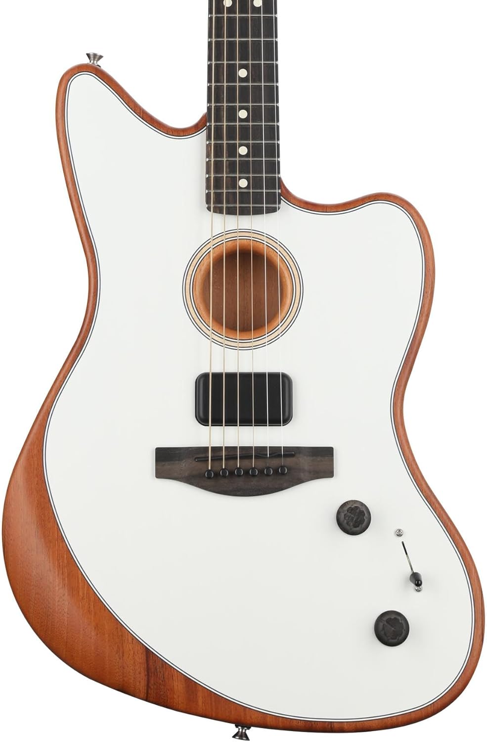 Chambered Jazzmaster with acoustic engine electronics and blendable voicing system. Spruce top and mahogany body construction with lightweight design. 3-way voice selector and mod knob for tonal shaping. Arctic White finish.
