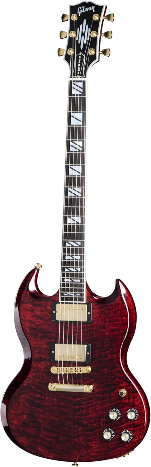 Gibson is excited to announce the return of the SG Supreme. With a refreshed feature set, it is bound to overshadow everything else in sight and be one of the most exciting new releases of the year. It features a beautiful AAA-figured maple top on a mahogany body. The mahogany neck has an ebony fretboard with a compound radius, 24 medium jumbo frets, and Super Split Block mother-of-pearl inlays. The headstock is adorned with a striking new mother-of-pearl “Chandelier Inlay” inspired by a design from the1940s that was discovered in the Gibson archives. The Burstbucker Pro and Burstbucker Pro + pickups are paired with push/pull volume controls for coil tapping, along with individual tone controls. The three beautiful finishes are elegantly highlighted with gold hardware, making this not only a great-sounding and highly flexible instrument but also an exceptionally beautiful-looking modern rock machine. A hardshell case is also included.