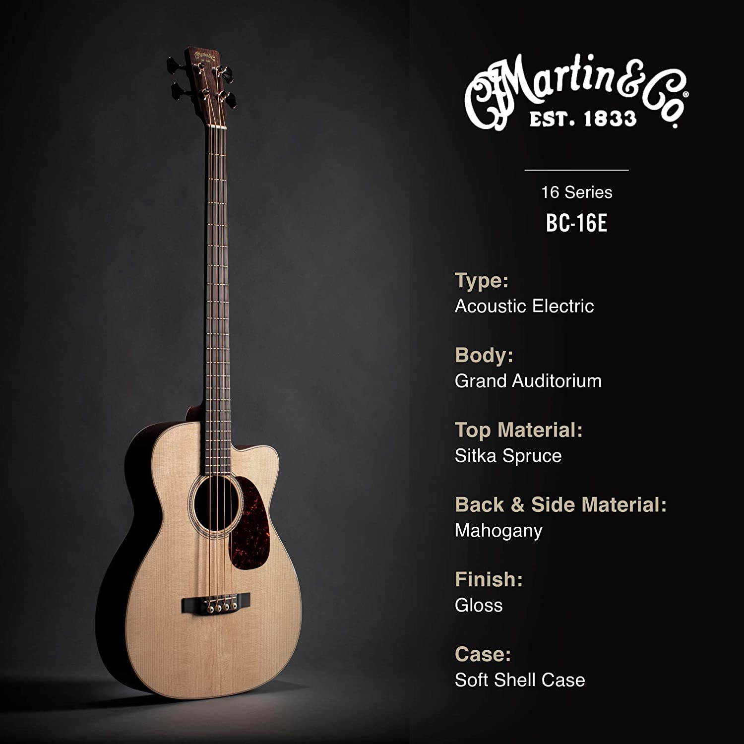 Martin Guitar BC-16E with Gig Bag, Acoustic-Electric Bass Guitar, Sitka Spruce and East Indian Rosewood Construction, Gloss-Top Finish, M-14 Fret, and Low Oval Neck Shape
